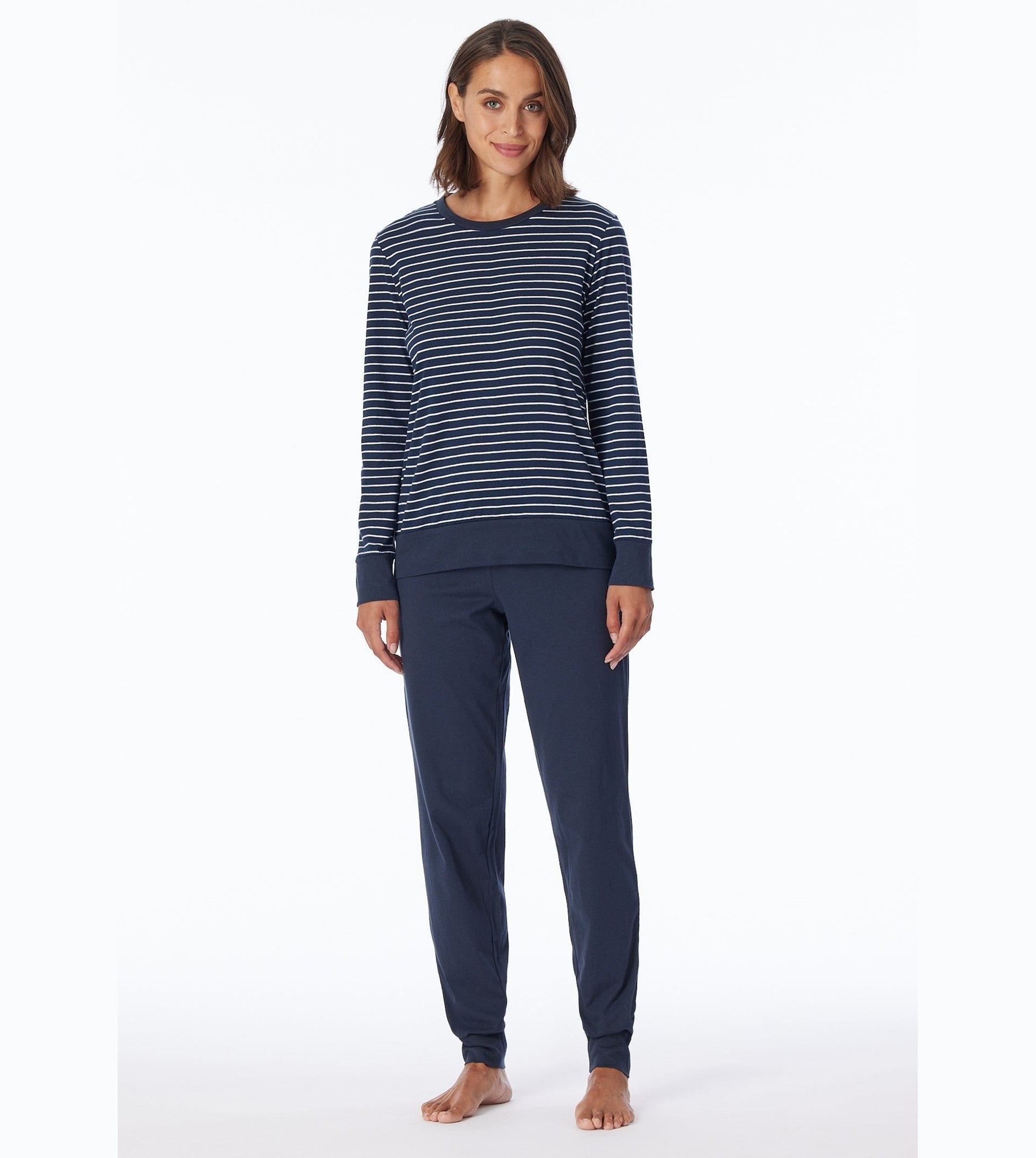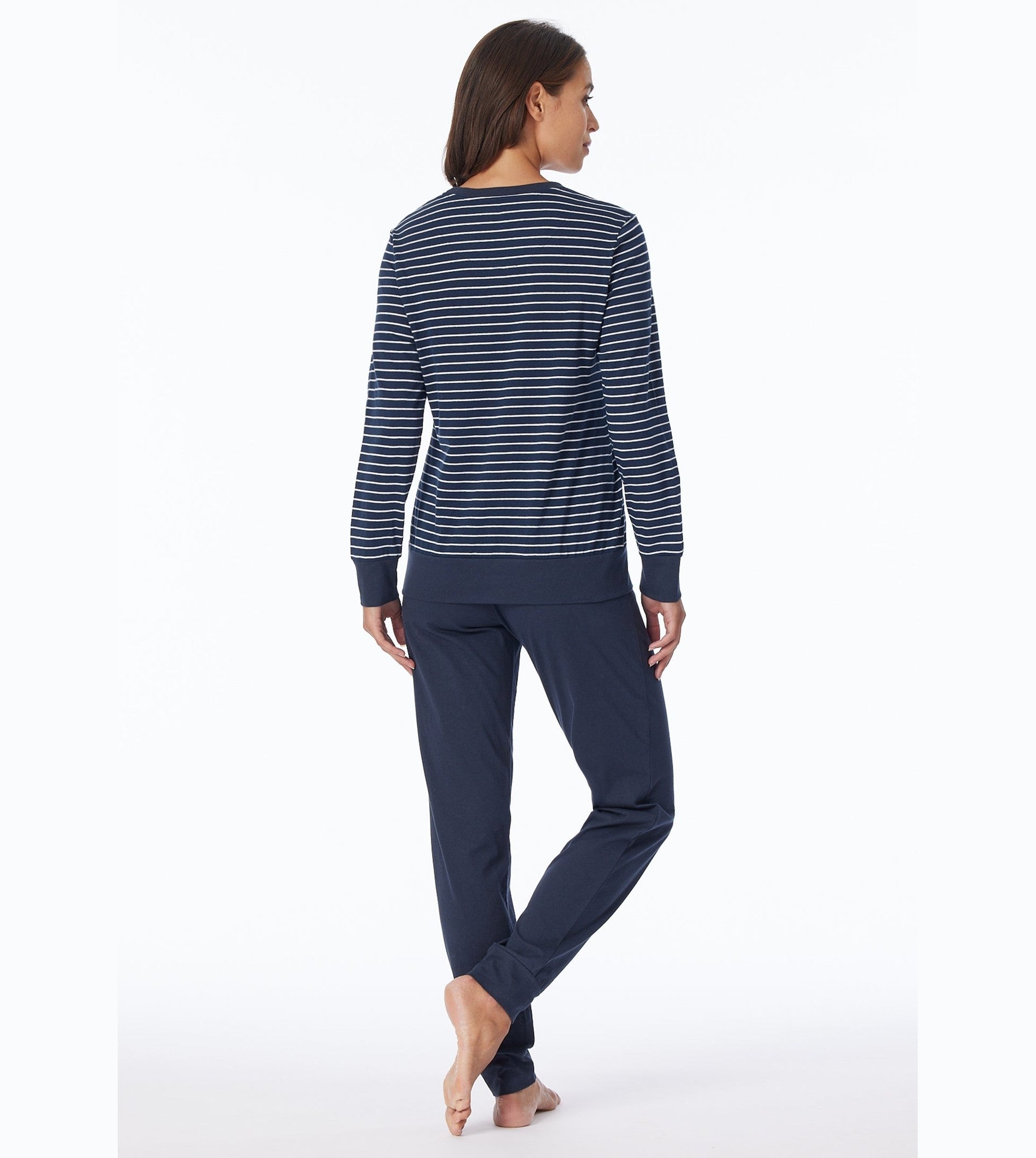 - Stijlvolle dames Schiesser pyjama uit de Uncover serie met donkerblauwe lange broek en een blauw gestreept shirt